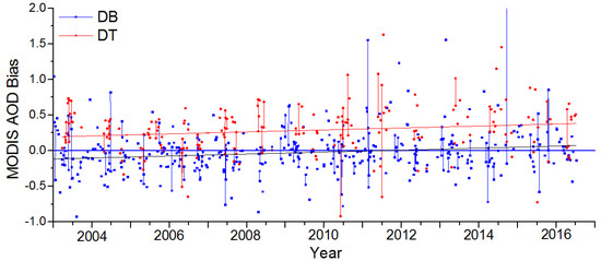Daily bias of Aqua MODIS C6 DB and DT AOD (AOD550 > 0.4) in Beijing from 2003 to 2016.