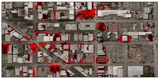 This study focuses on the machine-learned classification of rubble in remotely-sensed images taken in the aftermath of an earthquake event. Automated classifiers have shown promise detecting rubble in remote sensing images [8]. However, the impact of training data quality on classifier performance has received little attention in both earthquake damage detection and remote sensing as a whole. Even within the machine learning literature, label noise is usually simulated and assumed to be distributed uniformly [9,10]. In reality, objects that occur near rubble, like buildings and streets, are more likely to be mislabeled than unrelated structures, such as water or trees. Similar problems may arise if labeling instructions are not carefully specified. Figure 1 is an example of two user annotations of the same damaged structure where different labeling tools and instructions were used. User 1 was tasked with labeling “damage” and marked intact roofs that belonged to damaged buildings, an ambiguity that would confuse a classifier whose annotations of damage largely consist of rubble. We call this type of label confusion that occurs in spatially-contiguous regions of remote sensing imagery geospatial label noise. The effects of geospatial label noise can be seen in the map in Figure 2. This figure shows five individuals’ attempts to identify earthquake damage in an image. Bright red regions indicate areas that all labelers believed contained damage. Dark red regions indicate areas that only one labeler did. Noticeably, regions in which labelers tend to disagree with the majority vote happen in close geospatial proximity to regions in which all labelers agree.