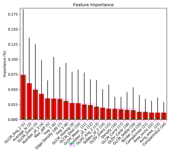 The 24 features with the highest feature importance values to the GEOBIA classifier.