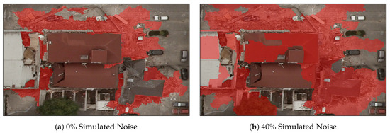 Figure 5. Simulated geospatial label noise using morphological dilation. Red pixels indicate rubble labels: (a) 0% simulated noise; (b) 40% simulated noise.