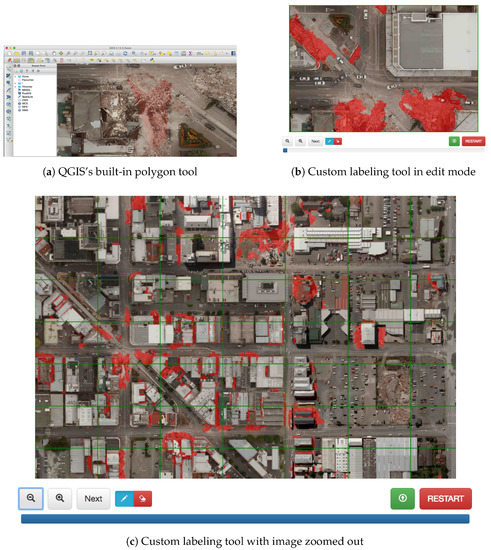 A comparison of labeling tools. (a) Labeling rubble using QGIS’s built-in polygon tool. (b) The editing mode of our custom labeling tool. The user labels segments via clicking and dragging her/his mouse. (c) A zoomed out view of our custom labeling tool. A tile outlined in green indicates that the user has already labeled it.
