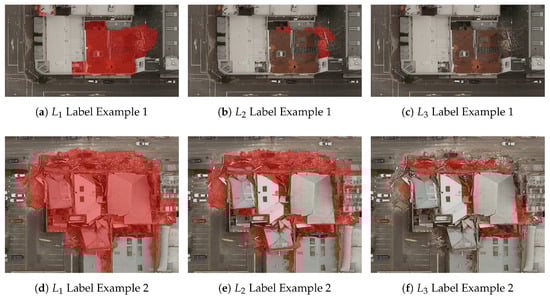 In summary, , and were not only labeled with different tools, but also with different definitions of damage. A closeup of the differing labeling styles can be seen in Figure 7 where the translucent red indicates labeled rubble. In both examples, encircles entire buildings when they are adjacent to rubble. primarily only covers rubble regions. labels nothing in Figure 7c and only labels the very centers of rubble patches in Figure 7f.