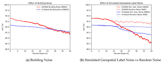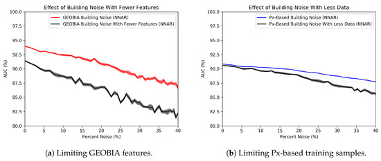 Figure 10b shows how the pixel-based classifier subjected to building noise changes when we only sample the number of data points available to the GEOBIA classifier, approximately three orders of magnitude smaller than its original size. Under these conditions, the pixel-based classifier does become more sensitive to noise. Its performance drops by percentage points, whereas the original classifier’s performance dropped by only three percentage points. This change accounts for much of the noise resilience disparity between the two classifier paradigms. The smaller training size allows for a larger variance of trees in the random forest because the trees are generated via sampling with replacement. This difference in classifier variance is visible in Figure 10b, where the standard deviation of the classifier using less data is significantly larger. Thus, because GEOBIA classifiers tend to use fewer samples, they are more prone to label contamination in training sets.