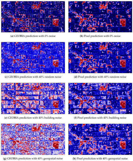 Probability heat maps with noise. Dark blue indicates that the classifier is confident that the segment or pixel is non-rubble. Dark red indicates that the classifier is confident that the segment or pixel is damage. White indicates that the classifier is unsure of the class of the segment or rubble. (a) GEOBIA prediction with 0% noise. (b) Pixel prediction with 0% noise. (c) GEOBIA prediction with 40% random noise. (d) Pixel prediction with 40% random noise. (e) GEOBIA prediction with 40% building noise. (f) Pixel prediction with 40% building noise. (g) GEOBIA prediction with 40% geospatial noise. (h) Pixel prediction with 40% geospatial noise.