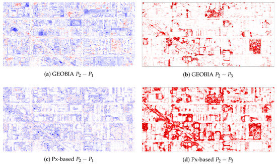 Prediction differences resulting from the use of , and . For any , areas that are red indicate locations where is more likely to label as rubble than . Areas that are blue indicate locations where is more likely to label as rubble than . Areas that are white indicate locations where both and agree. (a) GEOBIA . (b) GEOBIA . (c) Px-based . (d) Px-based .