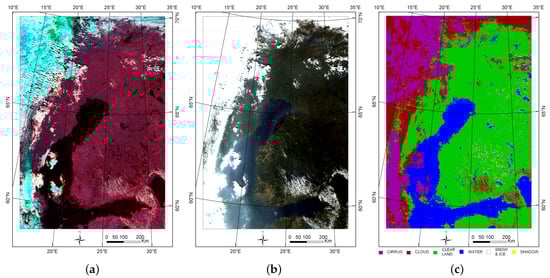 The results of the proposed method can be compared to published results from other methods applied to VIIRS images in Northern Europe. For the proposed method, the correct detection rate of clouds was 94.2% and false alarms rate 11.1%. For the VIBCM method in Northern Europe area [], a slightly higher correct detection rate was reported for clouds (94.5%), at the cost of a much larger false alarm rate (42.1%). However, the proposed method does not use thermal bands, yet reaches similar accuracies as the VCM and VIBCM methods, which makes it an interesting operational method for several sensors, including Sentinel-2. As an example, Figure 9 presents the result of cloud and shadow masking for a Sentinel-2 image acquired in June 2016 in Southern Finland, using the same method with corresponding bands from Sentinel-2 imagery.