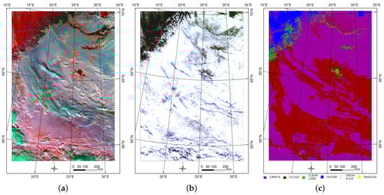 A Suomi NPP VIIRS image of 5 August 2014, at 09:28 a.m. (a) SWIR colour composite, RGB composite from 3.7 m, 2.2 m and 1.6 m reflectance; (b) Natural colours, Natural colour image from 0.672 m, 0.555 m and 0.490 m reflectance; (c) Cloud/shadow result, Cloud and shadow detection result.