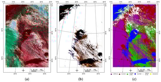 Because of a low sun angle, winter images were challenging in separation of snow and ice from the clouds. The snow index worked quite well, but part of the snow mixed with clouds. In winter images, the order of cirrus and snow detection affected the result. If snow and ice detection was performed after cirrus cloud detection, the snow detection found ice covered lakes from under the cirrus clouds. More generally, the threshold for the cirrus detection is subjective, and though the same threshold gave good results for all seasons’ images, some applications may need imagery with less cirrus cover removed. They are not visible in the visible bands, and so applications using only visible bands may use higher threshold for the cirrus detection. The subjective threshold can then be selected interactively from the cirrus band image. During winter season from end of November to end of January, the visual interpretation could not be done in the Northern part of Fennoscandia (with latitudes north of ) due to the low sun angle. In February 2015 a slightly bigger proportion of false alarms for clouds were observed in the latitudes north of about (Figure 8). This did not show in February 2016 results. The reason may be that in 2015 the thermal spring came one month earlier than in 2016 (according to the Finnish Meteorological Institute—http://www.fmi.fi) and there was a bigger amount of clear melted or nearly melted land pixels in the north. These pixels were wrongly assigned to cirrus or cumulus clouds and decreased the separation between clear land and cloud, which was the biggest mismatch in Table 3 with 120 occurrences.