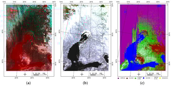 A Suomi NPP VIIRS image of 20 October 2014, at 10:39 a.m. (a) SWIR colour composite, RGB composite from 3.7 m, 2.2 m and 1.6 m reflectance; (b) Natural colours, Natural colour image from 0.672 m, 0.555 m and 0.490 m reflectance; (c) Cloud/shadow result, Cloud and shadow detection result.