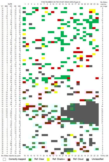 Figure 7 shows the misclassifications between cloud, shadow and clear classes by VIIRS image date (y-axis) and by reference point (x-axis) (see reference points on Figure 1a). Clear class contains all cloud-free and shadow-free surfaces including snow and water. False classifications are shown with the color of the reference class, so that a green box indicates a clear pixel was misclassified as cloud or shadow, yellow box indicates shadow misclassified as cloud or clear area, and red indicates cloud misclassified as clear land or shadow. Black color indicates that the visual interpretation has not succeeded to classify the pixel, such as from beginning of December 2014 to the end of January 2015, for the northernmost reference points (13 to 24 on Figure 1). This was due to the low sun angles at these latitudes in winter months. In February 2014 images and also the northernmost reference points a number of clear area pixels were misclassified to cloud or shadow.