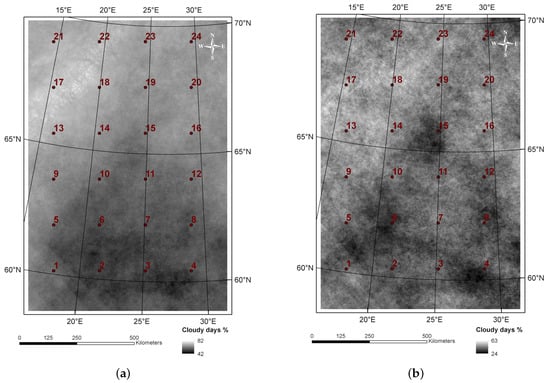 Cloudy days percentages computed on the whole Suomi NPP VIIRS dataset (a) and on summertime images (b). The numbered points from 1 to 24 are the visually interpreted reference points. (a) All VIIRS images (741); (b) Summertime images only (145).