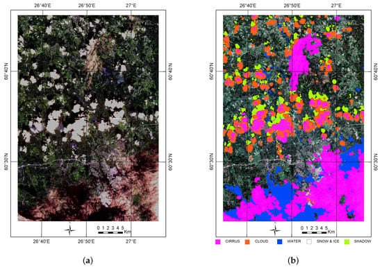 Extract of Sentinel-2 image of 29 June 2016, Southern Finland. (a) Natural colour image from 0.672 m, 0.555 m and 0.490 m reflectance. High clouds on land and sea areas are shown in magenta, low clouds in orange. (b) Cloud and shadow detection result. (a) Natural colour image; (b) Cloud/shadow result.