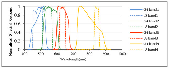 A comparison of the spectral response for the corresponding channels in the GF-4 PMS and Landsat-8 OLI.
