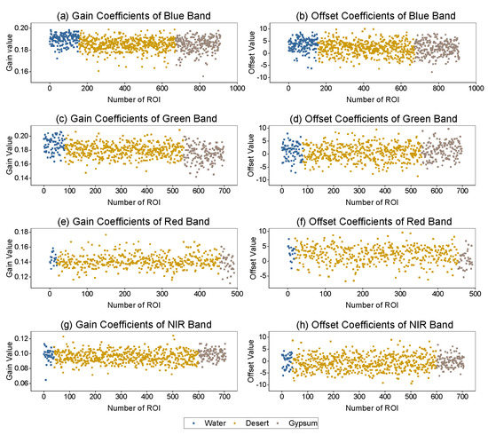 The radiometric calibration coefficients of the GF-4 PMS were calculated using the proposed method, based on the selected ROIs in the high reflective gypsum, medium reflective desert, and low reflective water test sites. Figure 6 shows the gain and offset coefficients of all ROIs for each band. In the figure, each point represents a ROI. For each band, the degree of consistency in the ordinate values of the points indicates the quality of the results.