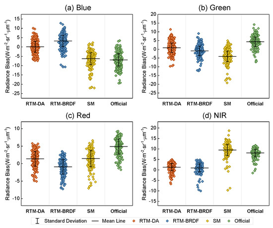 It can be seen from Figure 7 that the performance of RTM-BRDF method is similar to that of RTM-DA. In addition, RTM-DA and RTM-DA methods have smaller mean radiance biases than the SM method and official coefficients do, as the distribution of the biases are closer to 0 for all four bands. The calibration coefficients calculated by SM method and the official coefficients produce larger radiance biases, and the distributions of the biases are more dispersed from the mean, especially for the NIR band.