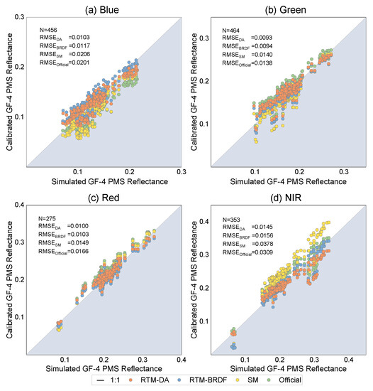 Evaluation of calibrated surface reflectance of GF-4 PMS using simulated surface reflectance by Landsat-8 OLI. The results of the four versions of calibration coefficients are plotted in this figure. The yellow points represent the results derived by the proposed method RTM-DA that distribute closest to the 1:1 line for the four bands when compared to the other methods.