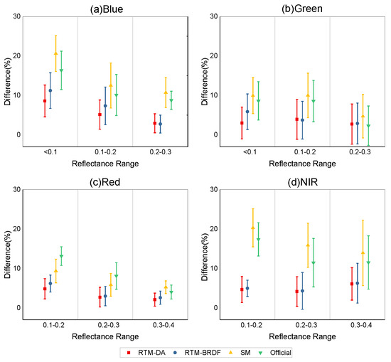 The mean differences between the calibrated surface reflectance of GF-4 PMS and the simulated surface reflectance by Landsat-8 OLI. The results of the four versions of calibration coefficients are plotted. The red error bars represent the validation results of the proposed method RTM-DA with the smallest mean and variance of differences in different ranges for the four bands.