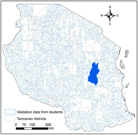 The validation data set collected by the students is closest to GlobeLand30 and the RCMRD data sets when considering the median of the student interpretations. Both of these data sets have a considerable amount of manual checking built into their classification workflows so are not the product of only automatic classification algorithms. Fully automated approaches have led to either overestimation (ESA-CCI) or underestimation (FROM-GC) of cropland. As shown by Yu et al. [15], FROM-GC underestimates cropland by around 37% compared to FAO statistics in the region that they refer to as Middle Africa, which would include Tanzania. The reasons that the authors provide for this underestimation include the problems with obtaining cloud-free images in tropical areas; field sizes are small so there may be spectral mixing at 30 m resolution; and misclassification errors due to insufficient training samples, e.g., paddy rice being misclassified as water. The slight differences in cropland definitions as highlighted above may also be contributing to this underestimation.