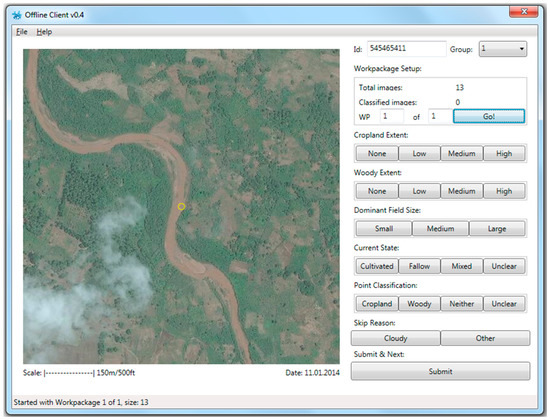A total of 15,383 images covered the Kilosa district wall-to-wall while the rest were randomly distributed across the rest of Tanzania (Figure 2). The campaign used a customized offline branch of the Geo-Wiki application, as shown in Figure 3, to visually interpret 1 km × 1 km VHR images. These RGB images, comprising a mosaic of mainly WorldView-2 imagery, were provided by Digital Globe through their viewing service, which is a Web Map Service (WMS). A resolution of 1 km was chosen because enough detail is visible in the imagery to be able to distinguish between cropland and non-cropland. Although 300 m would have been also possible, this would increase the sample size by almost 10 times and not much additional detail would be visible. Hence 1 km is a compromise between detail and efficiency in data collection. Data collection at 30 m would have required too many samples.
