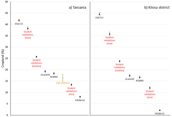 The validation data set collected by the students is presented in the results as the average (median), minimum (min), and maximum (max) cropland as observed by the students. The comparison of cropland values from different sources in Tanzania and Kilosa follow the same order, i.e., ESA-CCI > Validation data set (max and median) > GlobeLand30 > RCMRD > Validation data set (min) > FROM-GC. The highest value shown by the ESA-CCI data set is around 44% cropland in Kilosa, with FROM-GC showing the lowest value also in Kilosa, ca. 2%. Figure 5 shows the adjusted medians for the generalized linear mixed models (Section 2.3.2) run for (a) Tanzania (N obs = 170,296, N unique scenes = 25,935) and (b) Kilosa district (N obs = 95,251, N unique scenes = 14,533) with bars showing upper and lower 95% confidence limits. All sources are significantly different from each other except for the data from GlobeLand30 and RCMRD in the Kilosa district.