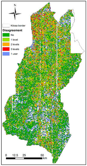Since the large majority of scenes had at least two interpretations from different people, several statistics could be obtained with regards to cropland coverage, with some of these being shown in Figure 5. Additionally, Figure 6 shows the disagreement between students spatially for each scene covering the Kilosa district. From the total number of scenes, 48% show complete agreement, 33% disagree by one level of cropland category, e.g., one user mentions low cropland and the other says no cropland or medium cropland. Additionally, 15% disagreed by two levels of cropland category, and complete disagreement (i.e., across three levels) occurred 4% of the time.
