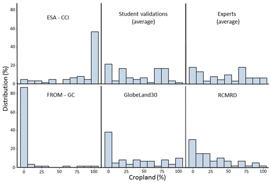 The information from each of these four products was aggregated to match the grid of the validation data set using ArcGIS zonal statistics to produce cropland proportions in each 1 km grid cell. The values from these four products were then extracted for each of the 25,943 1 × 1 km images interpreted by the students. From this sample, 22,190 had at least two interpretations from two different students and hence averages could be calculated across all evaluations. The resulting histograms are shown in Figure 4. Both the validation data and the ESA-CCI show a range of cropland proportions while the other data sets are heavily skewed towards lower proportions of cropland.