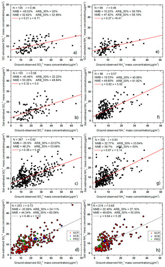 Evaluation of satellite-derived SO42− (b–d) and NH4+ (f–h) chemical component concentrations (the second line is for 2 × 2.5°; the third line is for 0.1 × 0.1°) and that of model-simulated data (a,e) (the first line) using in situ data collected from the literature. The colors of the symbols represent the regions to which the samples belong.