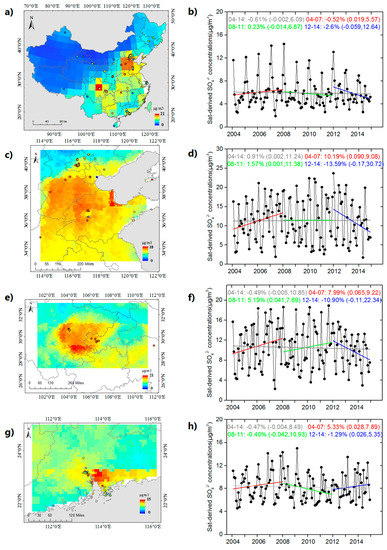 The left side of Figure 4 presents the spatial patterns of 11-year mean sulfate estimations (2004–2014) at different resolutions in China (Figure 4a) and the NCP (Figure 4c), SCB (Figure 4e) and PRD (Figure 4g). China showed an overall decreasing trend of 0.61% per year for SO42− concentration during the period 2004–2014. A negative trend of 0.52% per year was observed in 2004–2007, followed by a positive trend of 0.23% per year in 2008–2011, and a decreasing trend of 2.6% per year was observed in 2012–2014. To our knowledge, the growth of the Chinese economy over the past two decades has been mainly driven by rapid industrialization and urbanization, accompanying by large increases in in both electricity generation and the number of vehicles on roads [40]. The sources of SO2 emission mainly came from coal-fired power plants, industry, transport and residential combustion, and volcanic eruption [41]. As indicated by Geng et al., this reduction was mainly driven by power plants. Although the increasing electricity demand tended to increase SO2 emissions during the period 2005–2011, the reduced SO2 emission factor (EF) completely reversed SO2 emissions in the power sector, causing them to decrease at a rate of 1.4 Tg/year. The same decrease in sulfate concentration was confirmed by Li et al., who demonstrated a recent large reduction in sulfur oxide emissions from Chinese power plants based on satellite observations [42]. The 11-year mean SO42− estimations over China were characterized by distinct geographical differences, with sparsely populated, underdeveloped economies on the western side of the classic Heihe-Tengchong Line but a high-population-density, relatively prosperous development on the eastern side. Regarding the satellite-derived sulfate results (Figure 4a), the highest values over China were located in the SCB, followed by those in the NCP and the PRD, which were similar not only to the overlaid ground measurements but also to regional variations in satellite-observed tropospheric SO2 (SO2 vertical column density, VCD_SO2) obtained using OMI from 2005 to 2014 [43] and using the 2004–2009 SCIAMACHY [44]. As a major contributor to these results, the geographical patterns of sulfate concentrations were in agreement with the total PM2.5 estimations conducted by Ma et al. [27].