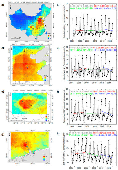 Spatial distribution of annual average satellite-derived SO42− concentrations at a resolution of 2 × 2.5°. (a) Overlaid with ground measurements. (b) Time series of monthly satellite-derived SO42− concentrations at the same resolution over China during the period 2004–2014. (c,d) Similar results to those presented in (a,b) but in the NCP at 0.1 × 0.1°. (e,f) Same as (c,d) but in the SCB. (g,h) Same as (c,d) but in the PRD.