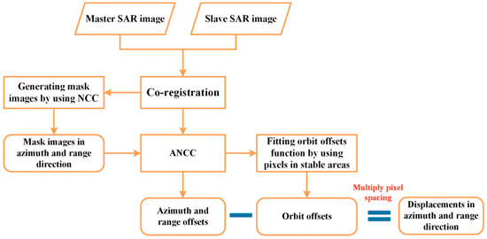 - Subtracting the fitted orbit offsets and generating azimuth and range displacements by multiplying the corresponding pixel spacing.