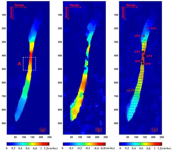 The average velocities of the Slumugllion landslide by using the proposed ANCC method with UAVSAR images on 19 August 2011 and 9 May 2012. (a) The azimuth velocities; (b) the range velocities; (c) the 2D velocities.