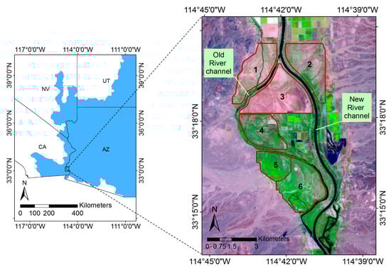 Location of the study area in the Lower Colorado River Basin (left). The six subareas in the right panel indicate parts of the Cibola National Wildlife Refuge (CNWR) included in this study.