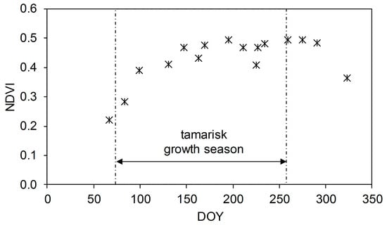 Average Normalized Difference Vegetation Index (NDVI) of the study area for all cloud-free Landsat scenes in 2008. DOY, day of year.
