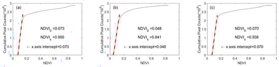 Cumulative NDVI frequency distribution for DOYs 195 (a); 227 (b); and 259 (c).
