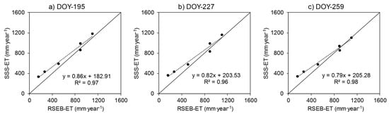 The evaluation of SSS performance was also conducted at the area-wide scale, where a comparison of the SSS-ET and RSEB-ET was made on all DOYs (195, 227, 259) over the six subareas within the CNWR. The reason behind performing an area-wide comparison was that the SSS method will most likely be implemented by water managers to obtain estimates over larger areas and to use the information in making decisions, as opposed to research applications that may require more details. Similar to the pixel-based comparison, the area-wide results had good agreement (R2 ≥0.96) with RSEB-ET estimates (Figure 5). The residual errors were smaller at 95, 90, and 71 mm∙year−1 for DOYs 195, 227, and 259, respectively. The percent errors were 14.9, 14.1, and 11.1% for the same DOYs, respectively.
