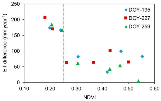 The area-wide comparison revealed a potential relationship between the magnitude of SSS-ET error and the vegetation density. The greatest difference between the two methods was 206 mm∙year−1 from subarea 3 for DOY 227. This subarea had the smallest average NDVI of 0.18. In contrast, the smallest difference in annual ET estimates was 4 mm∙year−1 from subarea 5 for DOY 259. The average NDVI was 0.54 over this subarea. To further investigate this relationship, the differences between the SSS-ET and RSEB-ET were plotted against the average NDVI of each subarea (Figure 6). The differences were greatest for NDVI values smaller than 0.25, but were reduced significantly and remained insensitive beyond this NDVI threshold. Subareas 1 and 3 had average NDVI values less than 0.25 for all three DOYs. Removing these subareas from the analysis resulted in a significant reduction in average residual errors to 58, 42, and 20 mm∙year−1 for DOYs 195, 227, and 259, respectively. The percent errors were also smaller, at 6.8%, 5.0%, and 2.4% for the same DOYs, respectively. The inverse relationship between the SSS-ET error and NDVI is expected, as this method was developed and calibrated to estimate the water use of riparian species. Thus, it underperforms over bare soil and low-vegetation areas.