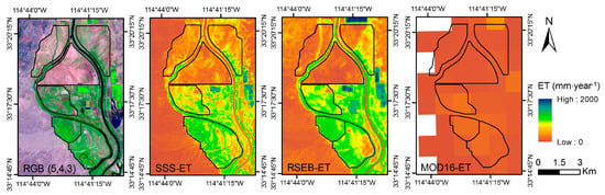 No significant differences in SSS-ET estimates were found among the three selected scenes, and all performed satisfactorily based on acceptable errors for VI approaches. The Landsat image of 17 August (DOY 227) was selected for the annual ET estimation for the validation year 2008. Previous studies [35,58,59] have suggested June to August as a representative period to characterize peak biomass and water use of riparian vegetation in western U.S. A visual representation of annual ET estimated by SSS, RSEB, and MOD16 for the year 2008 is shown in Figure 7. Missing pixels in the MOD16 map represent barren or sparsely vegetated areas where ET values are not estimated.