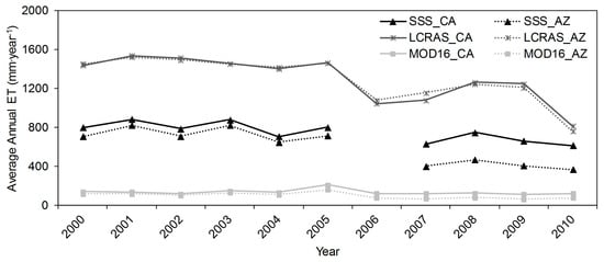 In the USBR LCRAS approach, daily riparian ET is estimated as a product of ETo and crop coefficients (Kc) and summed to obtain the annual ET. Climatological data from the California Irrigation Management Information System (CIMIS) and the Arizona Meteorological Network (AZMET) are used for these ET estimations. The details on ET estimation methods and procedures, as well as annual riparian ET from the CA and AZ areas of CNWR, are presented in the LCRAS reports [55,56]. For comparison with SSS estimation, LCRAS-ET estimates in acre-feet were divided by the CNWR area at each state (provided in the same report) to obtain the annual ET in units of water depth. The spatial extent of the CA and AZ regions in the LCRAS and SSS methods were not exactly the same, but similar enough to warrant a comparison between the two approaches. The LCRAS reports are available from 1995 to 2011. However, to be consistent with MOD16 data, a LCRAS–SSS comparison was conducted for the period from 2000 to 2010.