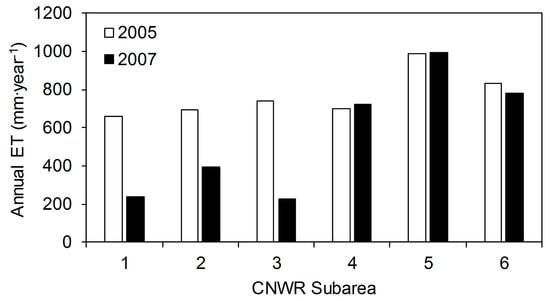 The massive wildfire of 2006 in the CNWR had a significant impact on riparian water use. The 4-year average annual SSS-ET after the wildfire (2007–2010) was 528 mm∙year−1, 30% smaller than the average (797 mm∙year−1) for the 4-year period before the fire (2002–2005). The wildfire had a greater impact in the northern parts of the CNWR (subareas 1, 2, and 3) as shown in Figure 10. The largest ET reduction was observed in subarea 3, where the ET reduced from 738 mm∙year−1 in 2005 to 227 mm∙year−1 in 2007 (69% reduction). Similarly, the annual ET over subareas 1 and 2 was reduced by 64% and 43%, respectively. Subareas 4, 5, and 6 showed a small reduction (3%), no change, and a small increase (6%) in water use between 2005 and 2007, respectively (Figure 11). This indicates that ET reductions in the northern subareas can be mainly attributed to the wildfire and not water stress caused by declines in groundwater levels. The potential impact of variable atmospheric demand was also ruled out, since ETo was 1774 mm∙year−1 in 2007, only 6% larger compared to ETo in 2005 (1668 mm∙year−1). The average 4-year ETo before and after the wildfire was 1720 mm∙year−1 and 1740 mm∙year−1, respectively. The lower ET rates over the northern parts of the CNWR due to wildfire of 2006 were also reported by [13].