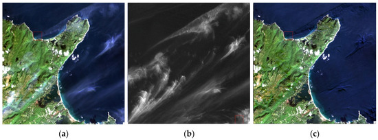 (a) A Landsat 8 Operational Land Imager (OLI) RGB image acquired over Cape Breton Island in eastern Canada (northeast to Halifax) on 16 September 2014; (b) The corresponding Band 9 (cirrus band) image; and (c) The cirrus-corrected RGB image.