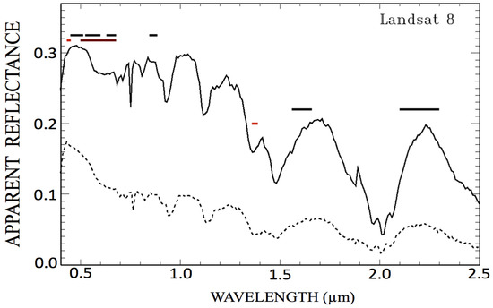 where L is the radiance measured by the satellite, μ0 is the cosine of solar zenith angle, and E0 is the extra-terrestrial solar flux. Since ocean waters are strongly absorbing at 0.7 µm and longer wavelengths, the surface contributions to the AVIRIS-measured apparent reflectances above 0.7 µm are essentially zero, and the measured apparent reflectances are approximately equal to the cirrus reflectances multiplied by the Sun-cirrus-sensor L-shaped two-way atmospheric gas transmittances. In the Figure 2 spectra, water vapor absorption features centered near 0.94, 1.14, 1.38, and 1.88 µm are largely due to absorption by water vapor molecules located above and within cirrus clouds. Ice absorption bands, for example those centered near 1.5 and 2.0 µm, are also seen in the Figure 2 spectra. For each of the AVIRIS spectra, the cirrus reflectances in the 0.45–1.0 µm spectral region are nearly constant with wavelength, because ice particles within cirrus are much larger than the wavelength and non-absorbing in the spectral region. The larger apparent reflectances in the 0.45–0.6 µm region are due to atmospheric Rayleigh scattering. Although the OLI SWIR1 and SWIR2 bands are not located near the centers of the two ice absorption bands, they are affected by ice absorption over the band passes, as seen in Figure 2. The measured reflectances at 1.375 µm are smaller than those in the 0.4–1.0 µm region, mainly because of absorption by water vapor above and within cirrus. The upper-level water vapor absorption effects need to be accounted for in order to use the 1.375-µm channel for the quantitative removal of cirrus effects in the 0.4–1.0 µm region, as described previously [13].