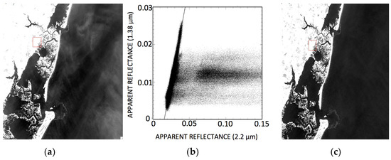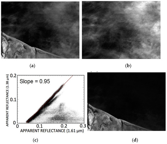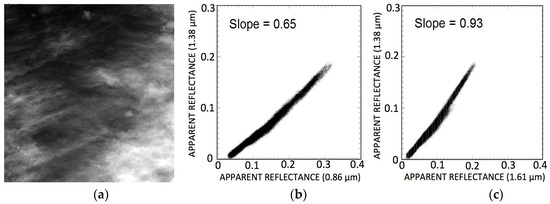 where S0.86 is the slope, which can be estimated from this scatter plot with, for example, the technique described by Gao et al. [13]. The derivation of the factor S0.86 this way makes use of both the spectral information (the 0.86-µm band and the 1.38-µm band within a pixel) and the spatial information (all pixels in the Figure 3a image). It should be pointed out that only one value of S0.86 per scene is derived, and S0.86 is not a pixel-by-pixel quantity. After obtaining S0.86, ρc(0.86 µm) can be calculated according to Equation (3).