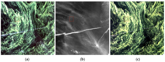 Figure 9 presents our third case study of cirrus corrections for OLI data. Figure 9a is a portion of an RGB image acquired over the Baltic Sea on 11 August 2015 during a peak chlorophyll bloom. The scene center is located approximately at 59.1° N and 21.2° E. The spatially diffuse thin cirrus clouds and an aircraft induced linear-shaped contrail cirrus are seen. Figure 9b is the Band 9 (cirrus) image. The diffuse thin cirrus features are seen more obviously in this image. It is noted that the aircraft-induced contrail cirrus is broken in the left portion of the contrail. This is due to the parallax effect associated with the OLI focal plane designs [8]. Figure 9c is the cirrus-corrected RGB image. By comparing Figure 9c with Figure 9a, it is seen that the diffuse thin cirrus features in the right half of the scene are removed in the Figure 9c image. However, the aircraft-induced linear-shaped contrail cirrus clouds remain to be seen in the Figure 9c image. This is because the contrail cirrus in Figure 9b is relatively shifted in the satellite along-track direction in comparison with that in Figure 9a. The subtraction of the scaled Figure 9b image from the Figure 9a image does not permit a complete removal of the contrail cirrus in the Figure 9a image.