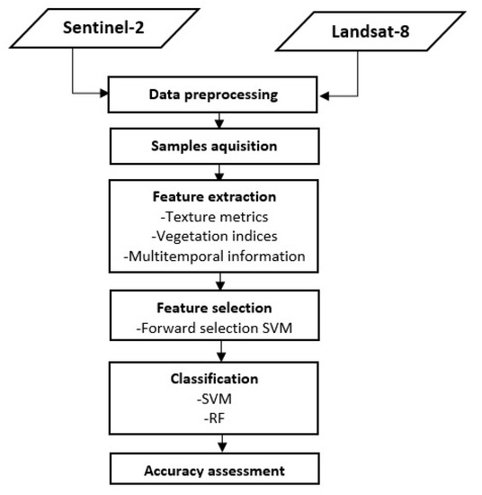 The addition of textural metrics, multitemporal information and vegetation indices in the classification process was important for increasing the accuracy of the Landsat-8 data classification, however, this did not bring meaningful improvements in the case of the Sentinel-2 images. For these latter data, the experiment that used spectral bands alone with the SVM classifier reached the highest accuracy, significantly superior to almost all of the experiments using Landsat-8 data. This fact can be explained by the greater spatial and spectral resolutions of MSI when compared to the OLI sensor.
