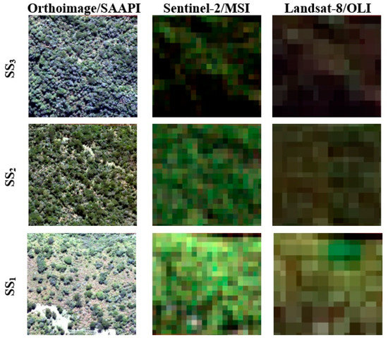 The selection of samples was based on the fieldwork accomplished by Faxina [43], on the photointerpretation of orthoimages with a 0.39 m spatial resolution (Figure 3), collected by the Airborne System for Acquisition and Post-processing Images (SAAPI), consisting of digital multispectral cameras, and also on current images of Google Earth. Figure 3 presents examples of the three classes of vegetation successional stages, acquired by SAAPI orthoimages and the corresponding Sentinel-2 and Landsat-8 subscenes.