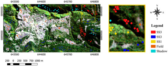 For accuracy assessment, independent sets of random points were generated for each classification result in a two-stage process. Initially, irregular polygons were manually delimited for each class directly in the images of both sensors, based on field observations and using very high spatial resolution images as ancillary data. In a second stage, inside each of these polygons, a stratified random sampling was conducted, where 70 pixels were selected for each of the three vegetation successional stages, 50 pixels for field and 50 pixels for the shadow class (Figure 4). This procedure was repeated for each classification to maintain the independence among the validation data sets. The number of samples was defined according to the work of Congalton and Green [83], who recommend a minimum of 50 samples for maps of less than one million acres in size and fewer than 12 classes.