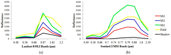 (a,b) Spectral reflectance curves of the vegetation successional stages for the multispectral bands of Landsat-8/OLI and Sentinel-2/MSI sensors, fall season.