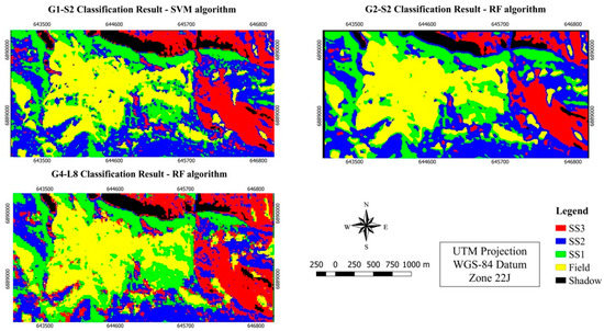Figure 8 shows the three best classifications produced by the present work. The inclusion of textural metrics, such as in the case of G2-S2, resulted in a more homogeneous classification due to the contextual window used for the reckoning of such metrics, which considers the information on the pixel neighborhood. This can be advantageous when trying to remove the undesirable effect of noisy pixels, such as small clearings, shadow and bare soil amid the vegetation. However, depending on the envisaged level of detailing, this resource may end up masking some features of interest. The classifications derived from the use of Landsat-8 data seem noisier than those resulting from the Sentinel-2 data, in which more patches of the intermediate successional stage (SS2) were erroneously classified as advanced stage (SS3). This can be ascribed to the worst spatial resolution of OLI, since larger pixels imply in a greater spectral mixture of classes. Besides that, the spectral resolution, chiefly responsible for discriminating targets, is comparatively restricted in this sensor.