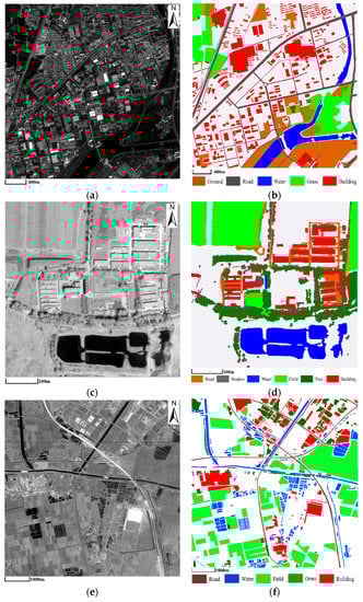 In order to assess the effectiveness of the proposed approach, three panchromatic satellite images with different scenes and spatial resolutions are used. The first data is a panchromatic Mapping Satellite-1 image with 1600 × 1600 pixels and 2 m spatial resolution, which was acquired on 13 August 2012 and covers an area of Miyun District, Beijing, China. As shown in Figure 2a, five major types of geo-objects, i.e., building, road, water, grass, and ground, occur in this image. The second data is a panchromatic QuickBird image with 900 × 900 pixels and 0.6 m spatial resolution, as shown in Figure 2c. It was acquired on 22 April 2006 and located in Tong Zhou district of Beijing, China. There are six major types of geo-objects distributed in the image, including building, road, water, shadow, tree, and field. The third data is a panchromatic ZiYuan-3 (ZY-3) image that was acquired over an area of Tanggu District, Tianjin, China, on 15 August 2015. The image size is 3500 × 3500 pixels, and the spatial resolution is 2.1 m. As shown in Figure 2e, the image is made up of five major types of geo-objects, including building, road, water, grass, and field. We manually annotated all the original images at the pixel level as ground truth label data through visual interpretation. The corresponding ground truth maps for three satellite images are shown in Figure 2b,d,f, respectively.