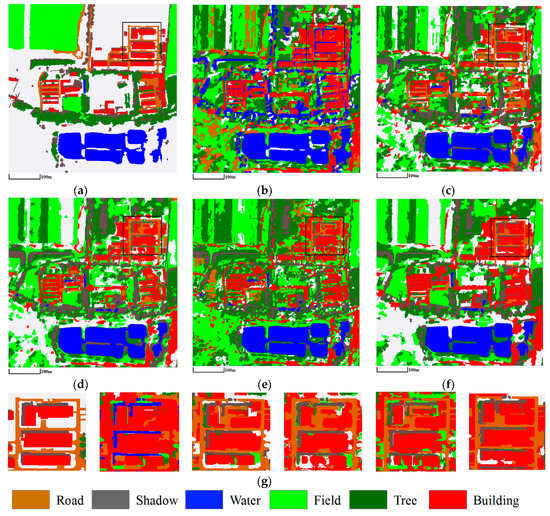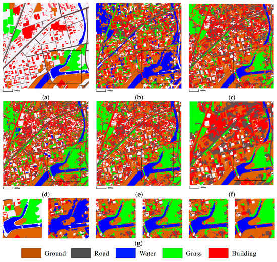 Classification results of various methods for the QuickBird image. (a) Ground truth map; (b) O_ISODATA; (c) O_LDA; (d) msLDA; (e) HDP_IBP; (f) mSegLDA; and (g) Details of (a–f).